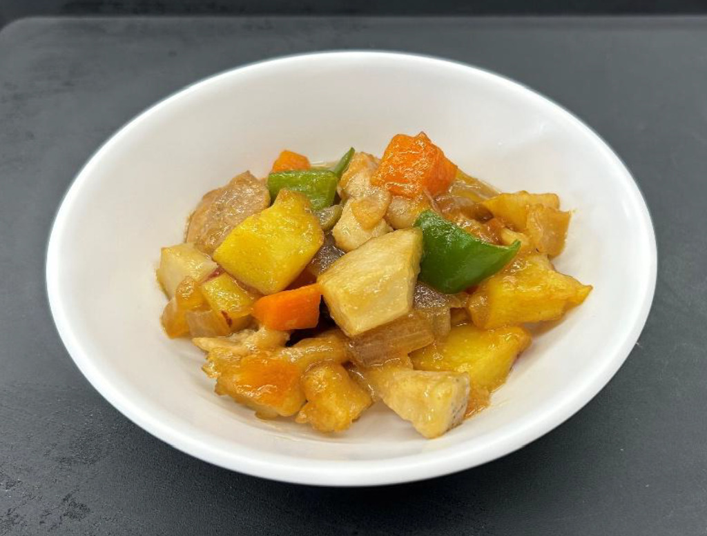 苦手な子が多いですが、小さかったり味が付いてると食べれられるという園児の希望を取り入れたピーマン、園児が大好きなさつまいもを揚げたもの、甘辛味の鶏肉、よく噛んでほしい願いを込めてレンコン等の根野菜を入れたメニューを考案しました。